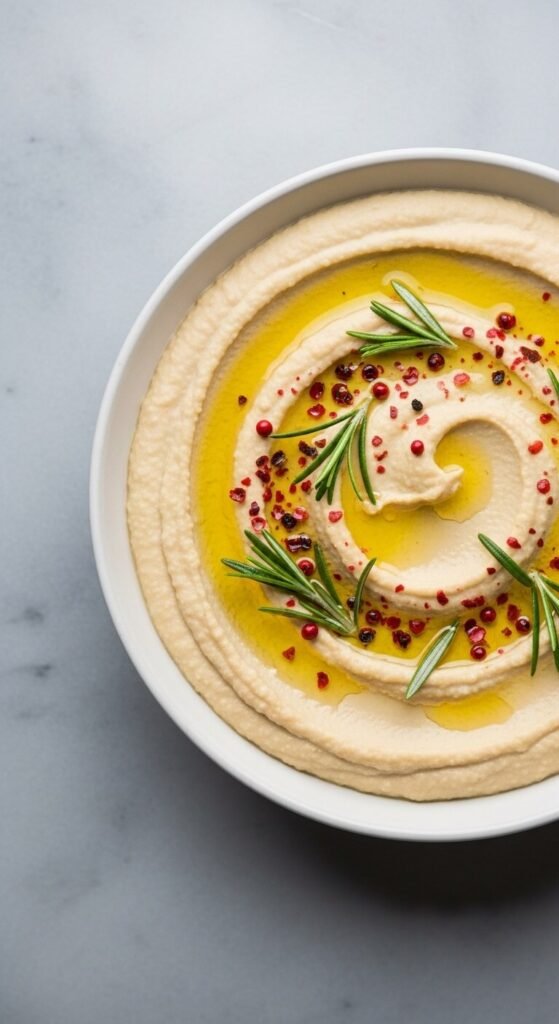 White beans (cannellini or navy) make a milder, creamier alternative. They have less of the nutty chickpea flavor but a beautifully silky texture. Blend with olive oil instead of tahini for something lighter. Add rosemary, lemon, and garlic. Great for people who find tahini too strong. This version pairs especially well with crostini or fresh vegetable sticks. One can of white beans costs about $1 at most grocery stores.
