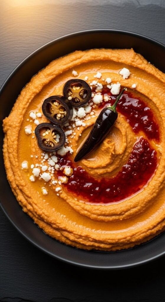 This is a seasonal, warming version perfect for fall and winter. Roast cubed butternut squash with olive oil and salt at 400°F for 25 minutes until caramelized. Blend into your hummus base with nutmeg, cinnamon, and tahini. The result is sweet, nutty, and satisfying. Top with toasted pumpkin seeds for crunch. You can buy pre-cut squash to save prep time. Makes a great holiday appetizer that looks impressive without much effort.