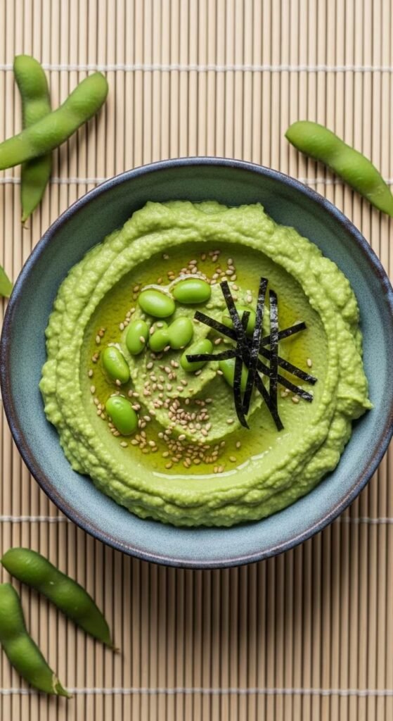 Edamame makes a vivid green, protein-rich hummus with a fresh, grassy flavor. Use frozen shelled edamame — thaw and boil for 5 minutes first. Blend with tahini, lemon, garlic, and a drizzle of sesame oil. A pinch of wasabi adds an optional kick. This one is popular with kids who might resist regular hummus. A bag of frozen edamame costs about $2–3 and makes a generous batch. Serve with rice crackers or cucumber rounds.