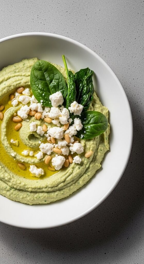 This version packs extra iron and protein into every bite. Wilt fresh or frozen spinach, squeeze out all liquid, and blend into your hummus. Add crumbled feta at the end — don’t blend it in, just fold it through. The salty cheese balances the spinach perfectly. A handful of pine nuts on top adds a nice crunch. Frozen spinach costs about $1.50 a bag. This makes a hearty dip or a filling spread for wraps and sandwiches.