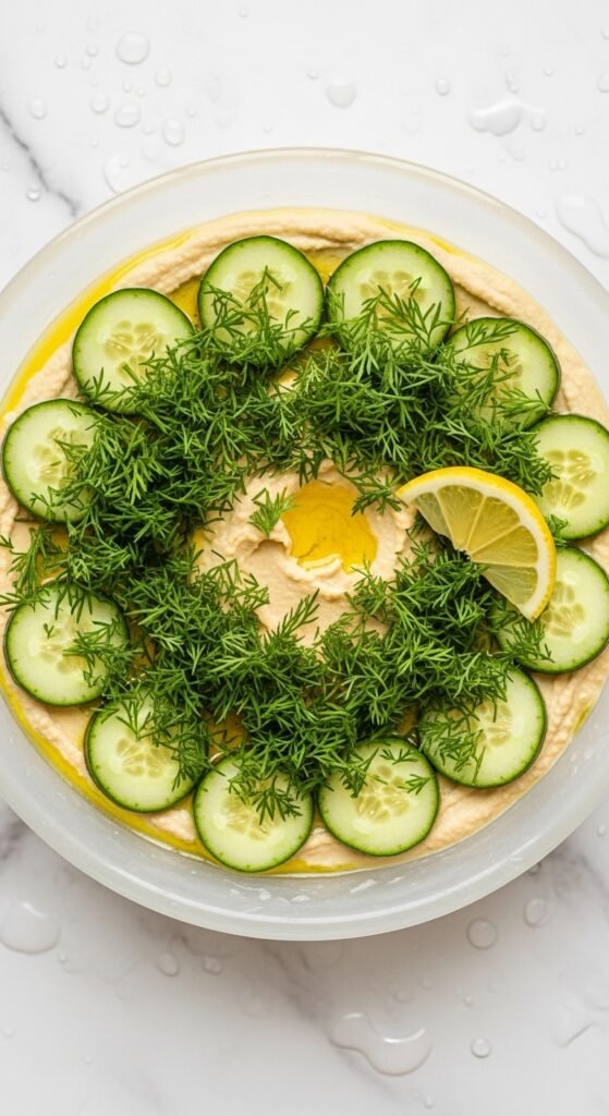 This one is built for warm weather. Blend half a peeled cucumber into your hummus base for extra moisture and a cooling, grassy flavor. Add dried or fresh dill generously — it’s the star here. A little Greek yogurt makes the texture even creamier. Serve chilled for best results. Works beautifully as a sauce for grilled chicken or fish. Cucumbers and dill are both inexpensive — under $2 combined — making this one of the cheapest variations to make.
