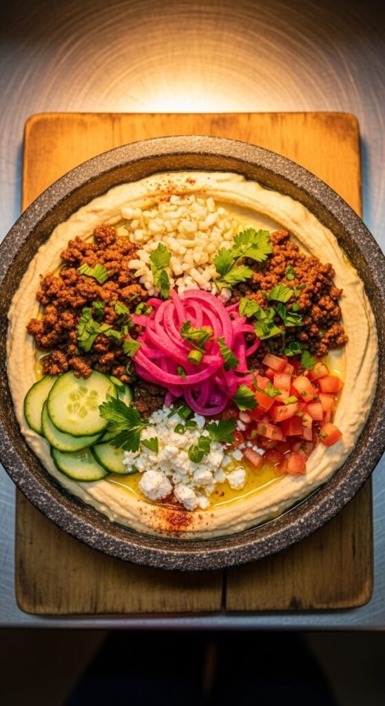 This isn’t just a dip — it’s a full meal in a bowl. Start with a thick base of plain hummus and build from there. Top with spiced ground meat (beef or lamb), pickled onion, diced tomato, cucumber, and a crumbled cheese of your choice. Warm the meat through with cumin, coriander, and cinnamon. Serve with flatbread for scooping. This is a great way to stretch one humble bowl into dinner for two. Total cost for a loaded version runs around $8–10.