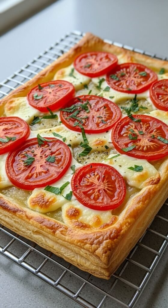 Spread boursin cheese on store-bought puff pastry and top with sliced tomatoes. Bake until pastry puffs and browns. One pack of puff pastry costs $4 and makes multiple tarts. Any herbed cheese spread works if boursin isn’t available. Cut into small squares for serving. The pastry gets flaky while cheese melts into tomatoes. Sprinkle fresh basil on top before serving.