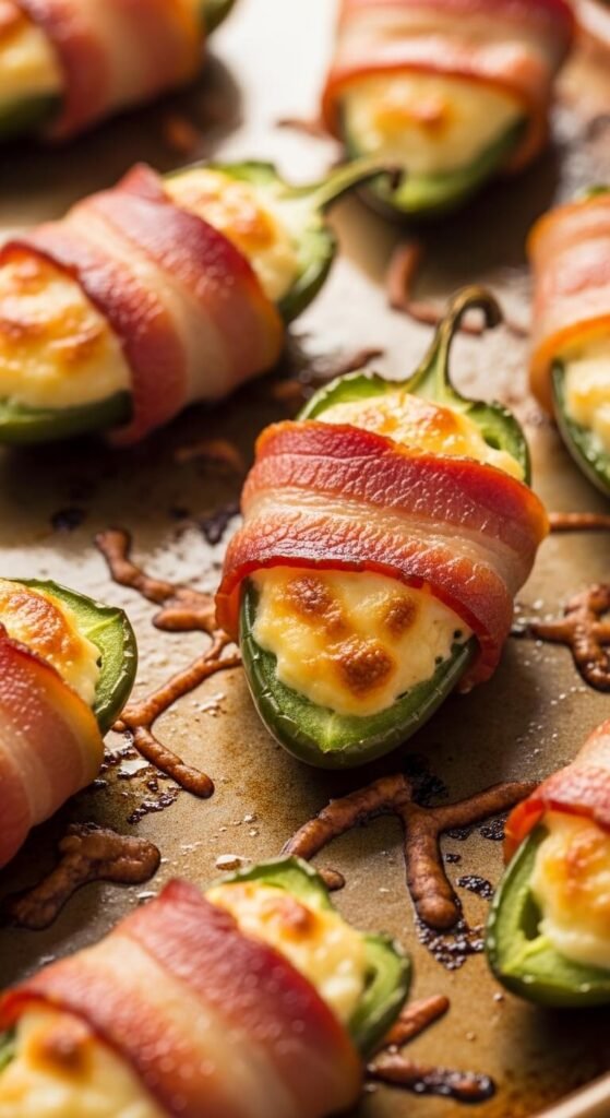 Halve jalapeños, fill with cream cheese mixed with cheddar, and wrap with bacon. Bake until bacon crisps and cheese bubbles. Wear gloves when cutting jalapeños to protect your hands. Remove seeds for less heat. These cost about 50 cents each to make. The bacon grease flavors the cheese perfectly. Make a double batch and freeze half before baking.