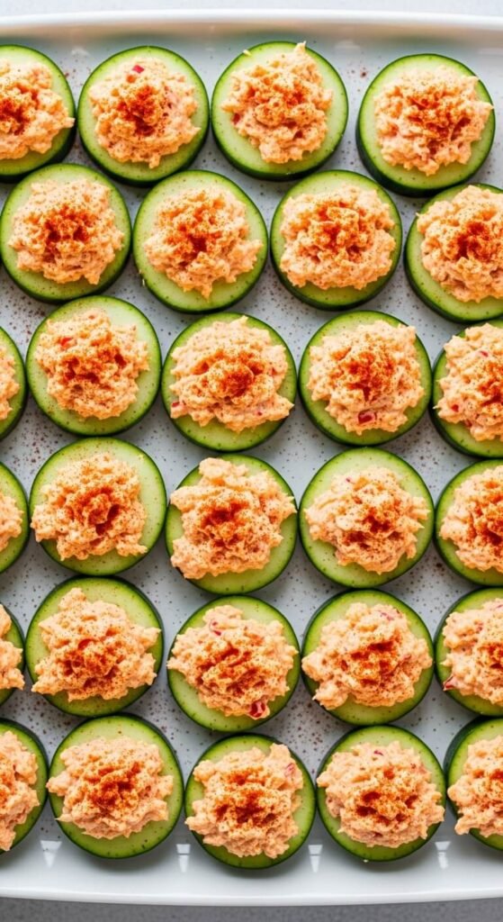 Slice cucumbers into thick rounds and top with homemade pimento cheese. Mix shredded cheddar, mayo, diced pimentos, and garlic powder. This southern classic costs almost nothing to make. The cucumber adds crunch without bread or crackers. Make the cheese spread two days ahead—it gets better as flavors meld. Each bite is cool, creamy, and refreshing. Perfect for summer parties.