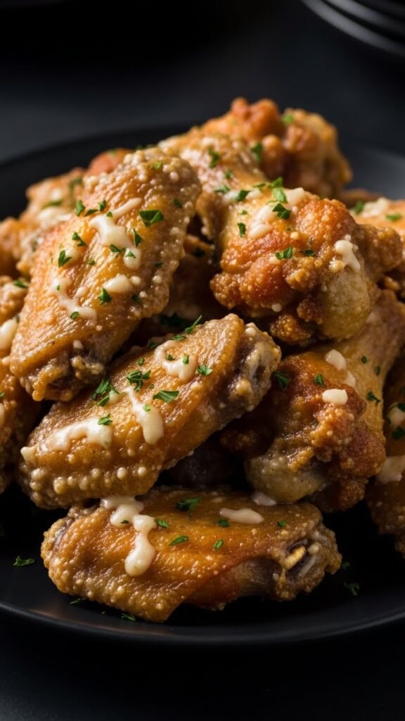 Bake wings at 425°F for 40 minutes, flipping halfway. Toss in melted butter mixed with minced garlic and parmesan. The high heat makes skin crispy without deep frying. Pat wings dry before baking for maximum crispiness. Frozen wings cost half as much as fresh. Make double batches—these disappear instantly. Serve with ranch or blue cheese for dipping.