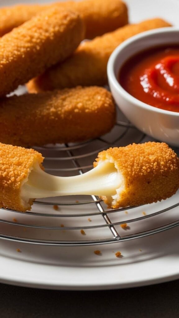 Freeze mozzarella sticks for 30 minutes before breading. Dip in flour, egg, then breadcrumbs twice. Bake at 400°F for 8 minutes until golden. The double breading prevents cheese leakage. String cheese works perfectly and costs less than mozzarella blocks. Air fryers make these even crispier in 6 minutes. Make a big batch and freeze half for next time.