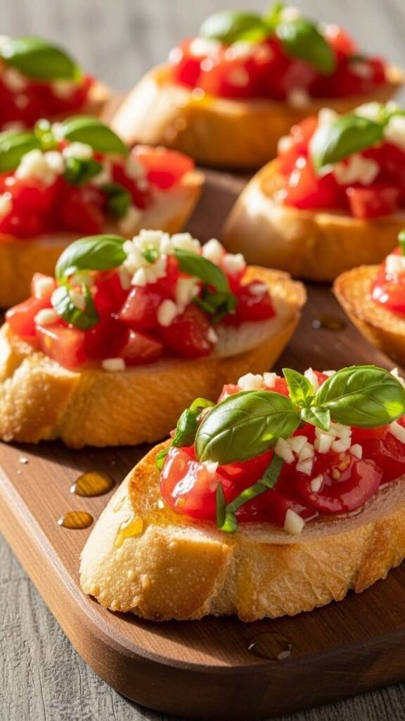Dice tomatoes, basil, and garlic. Mix with olive oil, salt, and pepper. Toast baguette slices until crispy. Spoon mixture onto bread right before serving to prevent sogginess. Day-old bread works great and costs less. Make the tomato mixture hours ahead—flavors improve as they blend. One baguette makes 20+ pieces for about $2.
