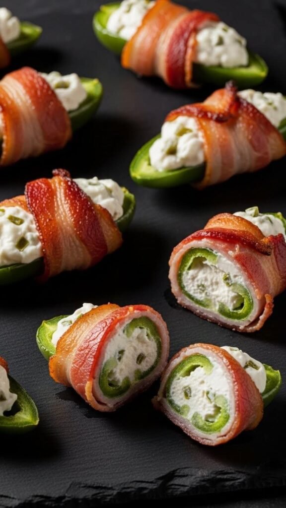 Cut jalapeños in half and remove seeds. Fill with cream cheese mixed with cheddar. Wrap in bacon and bake 25 minutes at 400°F. The bacon protects your hands from the heat. Wear gloves when cutting peppers to avoid burning skin. Use less expensive green chiles if jalapeños are pricey. These freeze wonderfully before baking.