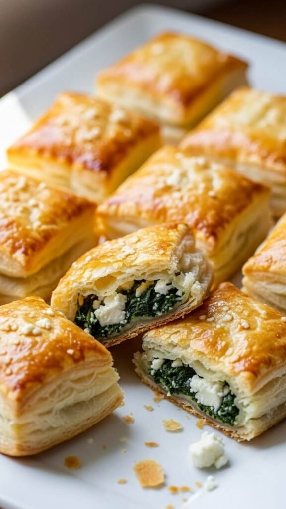Mix frozen spinach with feta and puff pastry squares. Fold corners over filling and bake 15 minutes at 400°F. The pastry puffs up beautifully and turns golden brown. Thaw puff pastry overnight in the fridge. Store-brand pastry costs $3 per box. Make mini versions by cutting squares smaller. These reheat in the oven without getting soggy.