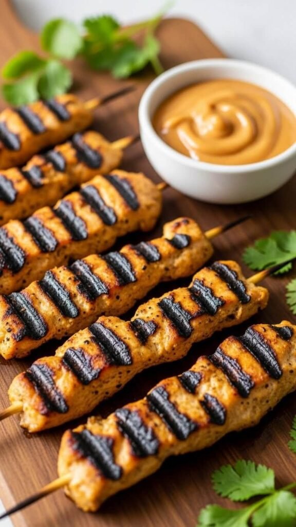 Cut chicken into strips and thread onto skewers. Marinate in soy sauce, ginger, and garlic for 30 minutes. Grill or broil 3 minutes per side. Serve with peanut sauce made from peanut butter, soy sauce, and lime. Bamboo skewers cost pennies and work perfectly. Use chicken thighs—they’re cheaper and stay juicier than breasts. Make sauce ahead and refrigerate up to a week.