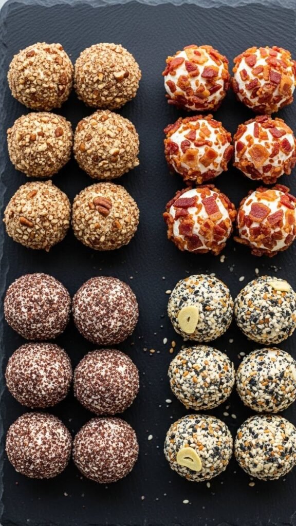 Mix cream cheese with cheddar and seasonings. Roll into small balls and coat in nuts, bacon, or herbs. Chill 2 hours before serving with crackers. These look fancy but take 15 minutes to make. Use whatever toppings you have on hand. One block of cream cheese makes 20+ balls for under $4. Make a week ahead and keep refrigerated.
