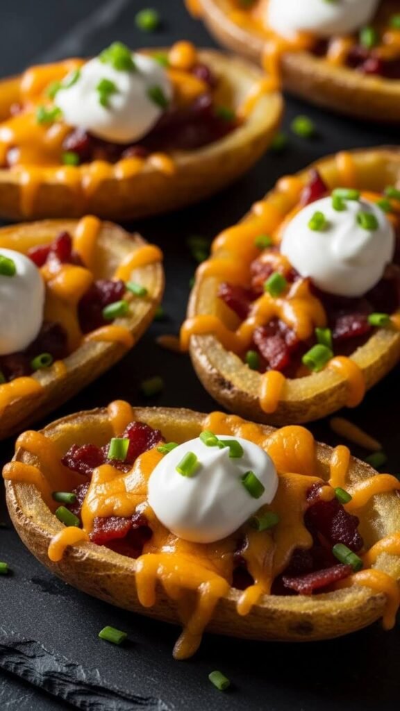 Scoop out baked potatoes and brush the skins with olive oil. Bake at 400°F until crispy, about 15 minutes. Fill with shredded cheese and bacon, then return to the oven. The cheese melts perfectly in 5 minutes. Top with sour cream and green onions right before serving. Use russet potatoes—they’re cheaper and hold their shape better. Make these ahead and reheat when guests arrive. Each potato makes 4-6 pieces, so grab a 5-pound bag for around $3.