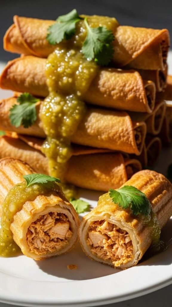 Mix shredded chicken with salsa verde and cheese. Roll tightly in corn tortillas and place seam-side down on a baking sheet. Brush with oil and bake 20 minutes at 425°F. The tortillas get crispy without frying. Rotisserie chicken saves time and costs less than cooking chicken yourself. Make 50 taquitos from one chicken for about $6. Freeze extras before baking.