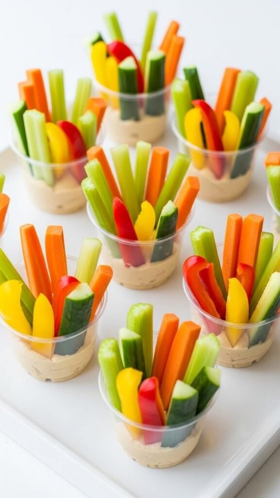 Fill small cups with store-bought hummus. Stand veggie sticks upright in the hummus. Each person gets their own serving—no double-dipping. Cut vegetables the night before and store in water to keep crisp. Generic hummus costs half as much as name brands. Mix things up with different dips like ranch or tzatziki. One container of hummus makes 8-10 cups.