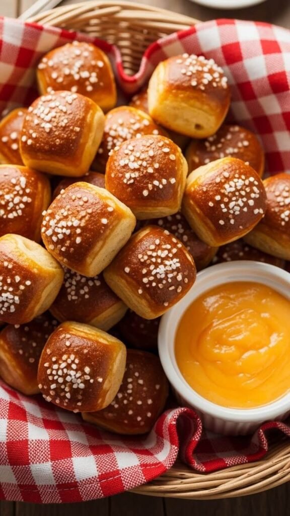 Cut store-bought pizza dough into small pieces. Boil in baking soda water for 30 seconds, then bake 12 minutes at 425°F. Brush with butter and sprinkle coarse salt. The baking soda creates that classic pretzel crust. Make cheese sauce from velveeta and milk. Pizza dough costs $1 and makes 40+ bites. Kids love helping roll and shape these.
