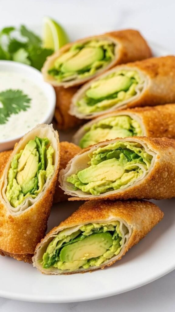 Mash avocados with cilantro, tomatoes, and lime juice. Roll in egg roll wrappers and brush with oil. Bake 15 minutes at 400°F, flipping once. Baking saves calories without sacrificing crispiness. Buy avocados when on sale and freeze the filling. Wonton wrappers work too and cost less. Mix sour cream with lime juice for quick dipping sauce.