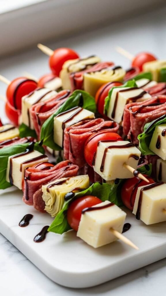 Thread salami, cheese, artichokes, and tomatoes onto skewers. Drizzle with balsamic glaze. These need zero cooking—just assembly. Buy deli meat on sale and freeze extras. Use whatever pickled vegetables you have. Mix up ingredients for variety. One package of each ingredient makes 20+ skewers for under $8.