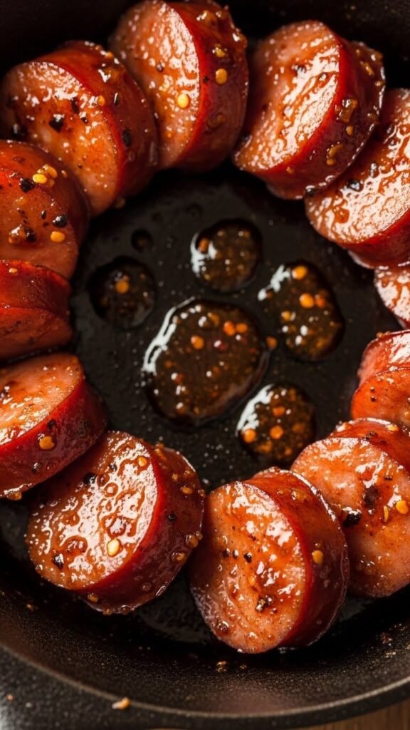 Slice kielbasa into rounds. Cook with brown sugar, chili sauce, and mustard until glazed. The sauce caramelizes around the sausage creating sticky-sweet bites. Use a slow cooker to keep warm during the party. One package of kielbasa makes 40+ pieces for about $4. Turkey kielbasa works great and costs less. Make this 100% hands-off in a crockpot.