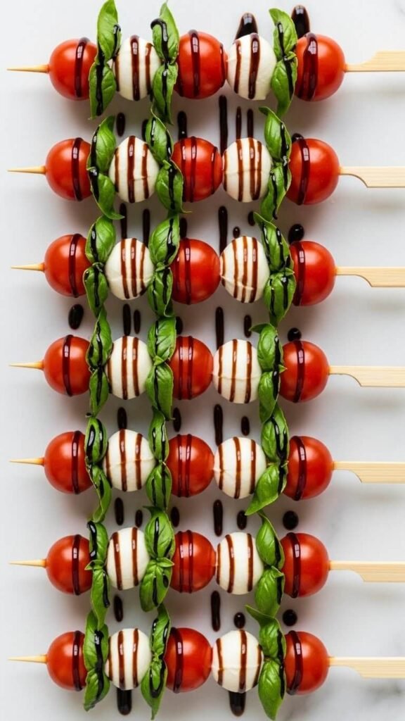 Thread cherry tomatoes, mozzarella balls, and fresh basil onto toothpicks. Drizzle with balsamic glaze and olive oil. Add a pinch of salt and pepper. These take 10 minutes to assemble and look restaurant-quality. Buy mozzarella in bulk at warehouse stores for half the price. Use grape tomatoes when cherry tomatoes are expensive. Make these an hour ahead and keep refrigerated. The flavors blend beautifully as they sit.