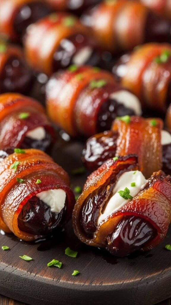 Cut bacon strips in half and wrap around pitted dates. Secure with toothpicks and bake at 400°F for 15-20 minutes. The bacon gets crispy while dates turn sweet and soft. Stuff dates with cream cheese or goat cheese before wrapping for extra richness. Regular bacon works fine—no need for expensive thick-cut. Flip halfway through baking for even crispiness. These reheat well in the oven.