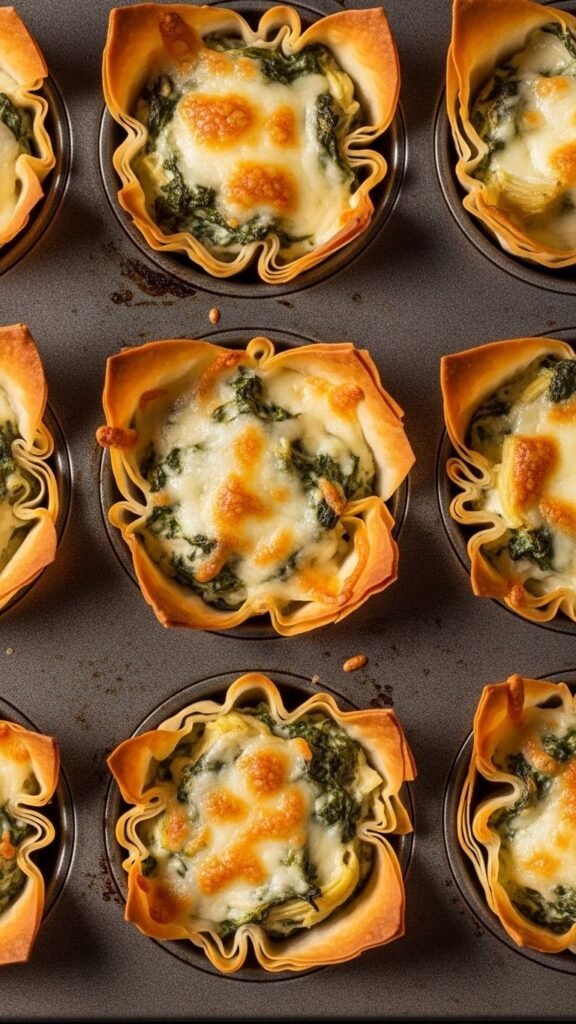 Press premade phyllo cups into a muffin tin. Mix frozen spinach, artichoke hearts, cream cheese, and parmesan. Spoon mixture into cups and bake 12 minutes at 350°F. The cups stay crispy and hold their shape perfectly. Store-bought phyllo cups cost about $4 for 15 shells. Skip the artichokes to save money—the dip still tastes amazing. These hold up at room temperature for an hour.
