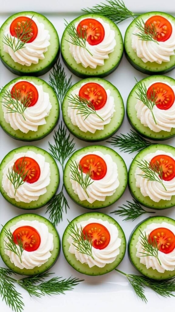 Slice cucumbers into thick rounds. Pat dry with paper towels to prevent sogginess. Pipe or spread herb cream cheese on each round. Top with tomatoes, olives, or smoked salmon. These stay fresh and crunchy for hours. English cucumbers work best because they have fewer seeds. Mix cream cheese with ranch powder for instant flavor. Make 50 bites from one cucumber for about $2.