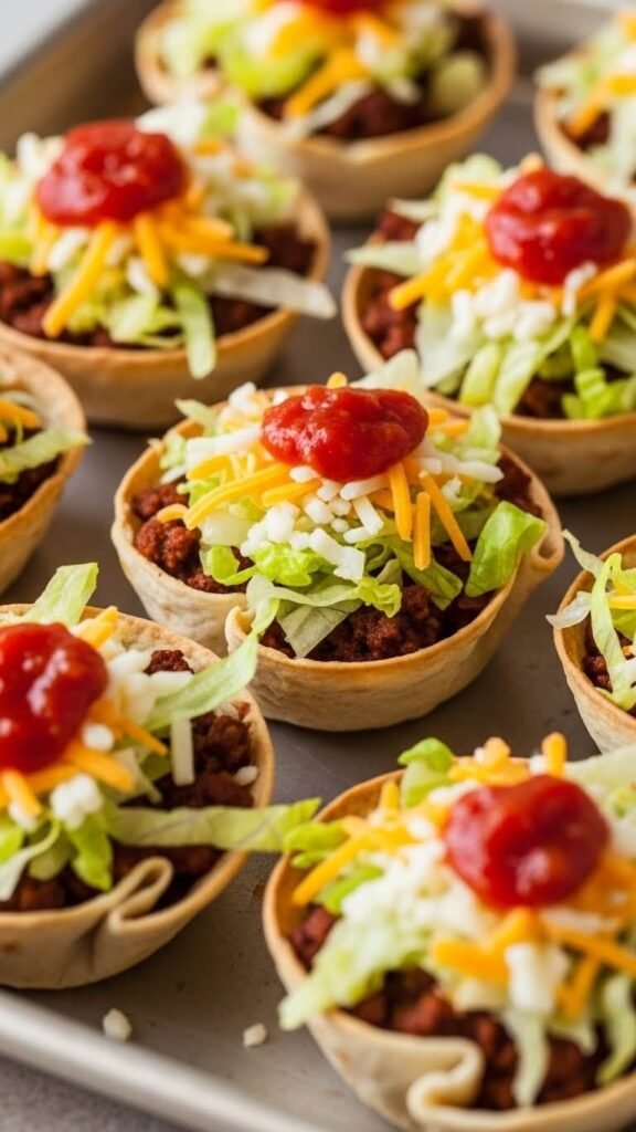 Press small tortillas into muffin tins and bake until crispy. Fill with seasoned ground beef, cheese, lettuce, and salsa. Each cup is a complete taco in one bite. The tortilla stays crunchy even with toppings. Use taco seasoning packets—they’re cheaper than buying individual spices. Ground turkey costs less than beef and tastes just as good. Prep toppings ahead and assemble right before serving.