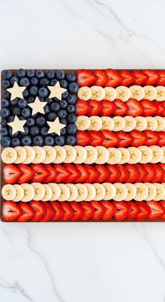 Want to upgrade it further? Add small toothpick flags, a bowl of marshmallow fruit dip in the center, or tuck in some star-shaped watermelon cutouts using a cookie cutter.