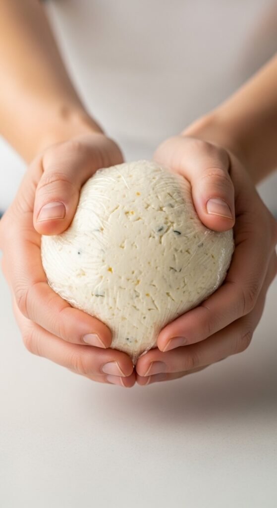 Here’s where patience pays off. Scoop your cheese mixture onto a large piece of plastic wrap, then use the wrap to shape it into a ball (or log, if you prefer). The plastic wrap method keeps your hands clean and helps create a smooth, uniform shape.
