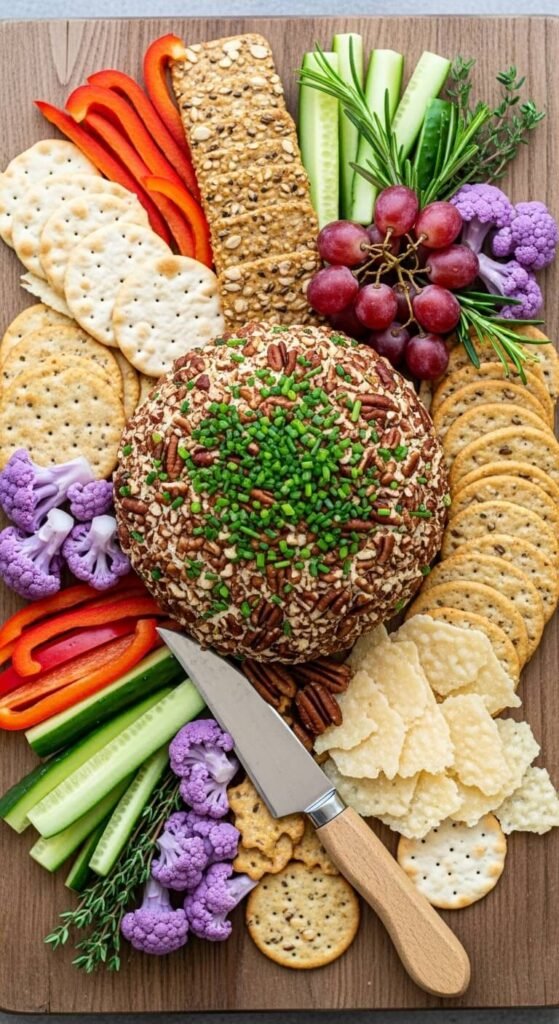 Presentation matters! Place your finished cheese ball on a pretty serving board or plate. Surround it with an assortment of crackers, sliced baguette, pretzel crisps, and fresh vegetables like bell pepper strips and celery sticks.