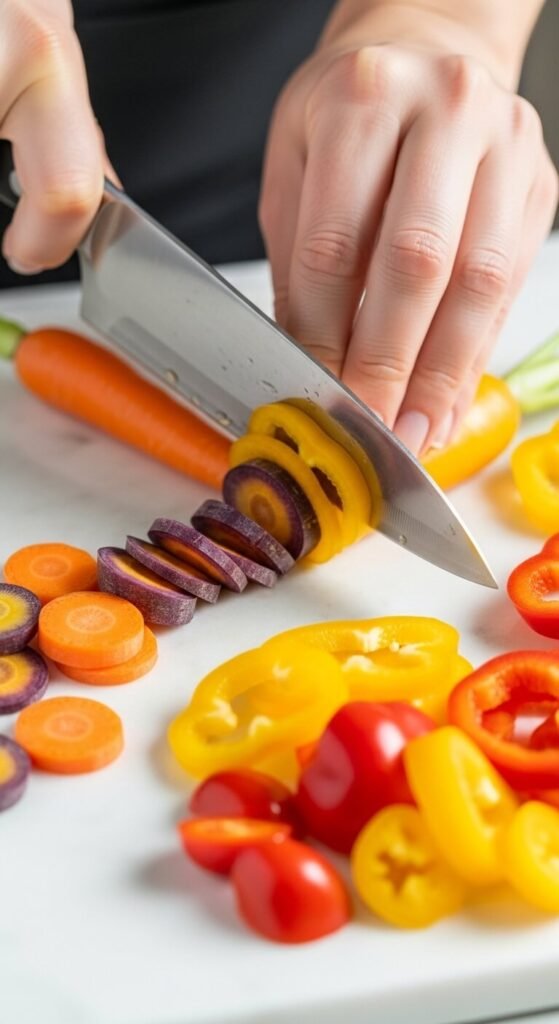 The Rainbow Method: Arrange vegetables in color order (red tomatoes, orange carrots, yellow peppers, green cucumbers, purple cabbage). It’s Instagram-worthy and creates visual impact.