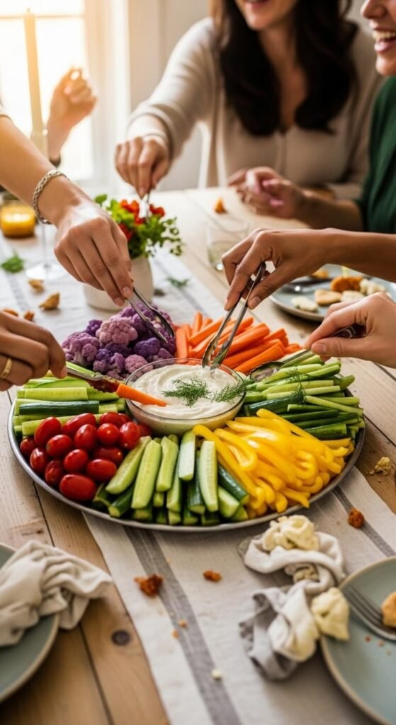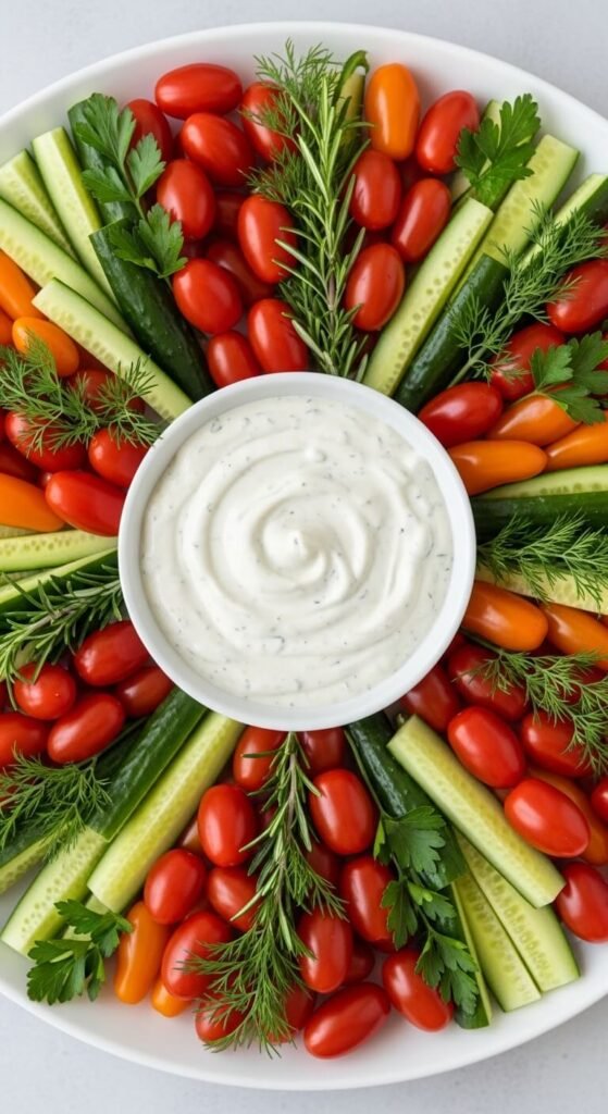 The Wreath Style: Perfect for holidays. Arrange veggies in a circular pattern with cherry tomatoes as “berries” and herbs tucked in for greenery.