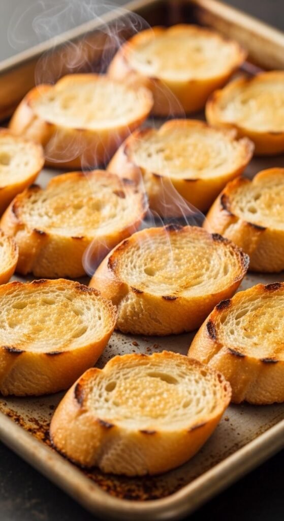 [Image Prompt] Diagonal slices of rustic baguette bread arranged on a cutting board, showing the perfect ½ inch thickness and golden-brown crusted exterior.