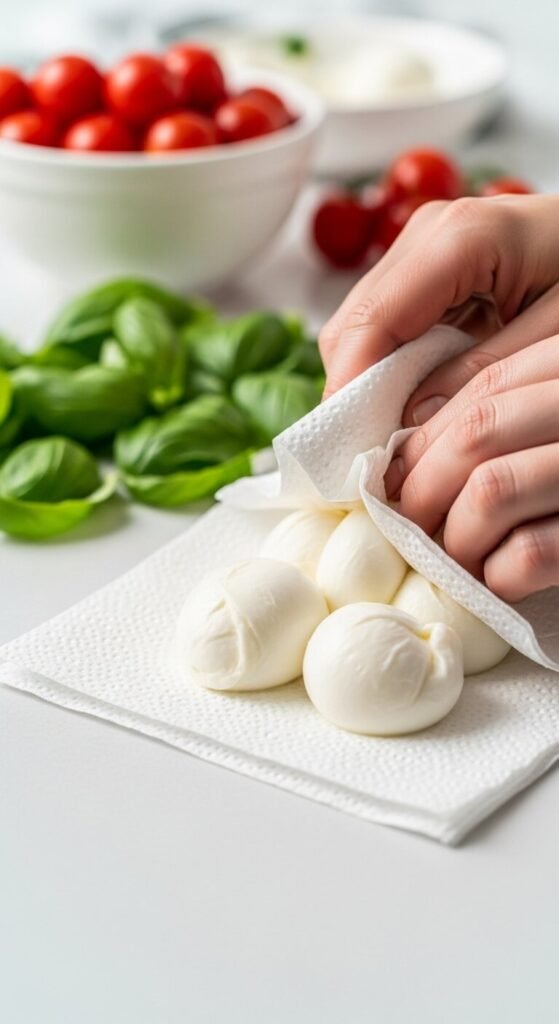 Pat everything completely dry. Use paper towels to remove excess moisture from washed tomatoes, mozzarella (especially if it’s packed in water), and basil leaves. Moisture is the enemy of stability.