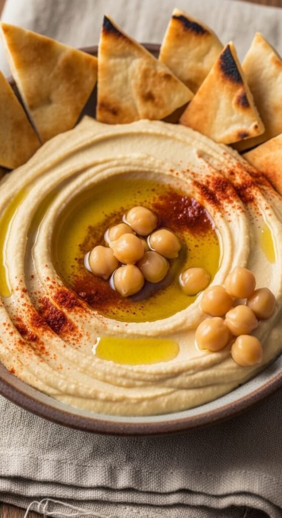 Blend canned chickpeas, tahini (or peanut butter as a swap), lemon juice, garlic, and olive oil until silky smooth. Spread into a shallow bowl, swirl the top with a spoon, drizzle with olive oil, and dust with smoked paprika. Serve with warm, golden pita triangles.