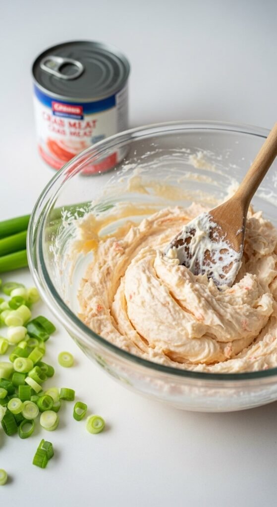 A good ratio: 8 oz cream cheese to about ½ cup crab, finely shredded. That keeps the filling cohesive rather than chunky, which helps with sealing.