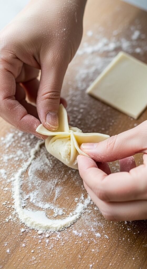 This is where most people go wrong. There are a few different ways to fold crab rangoon — the triangle fold, the star fold, the classic purse — but they all share one golden rule: