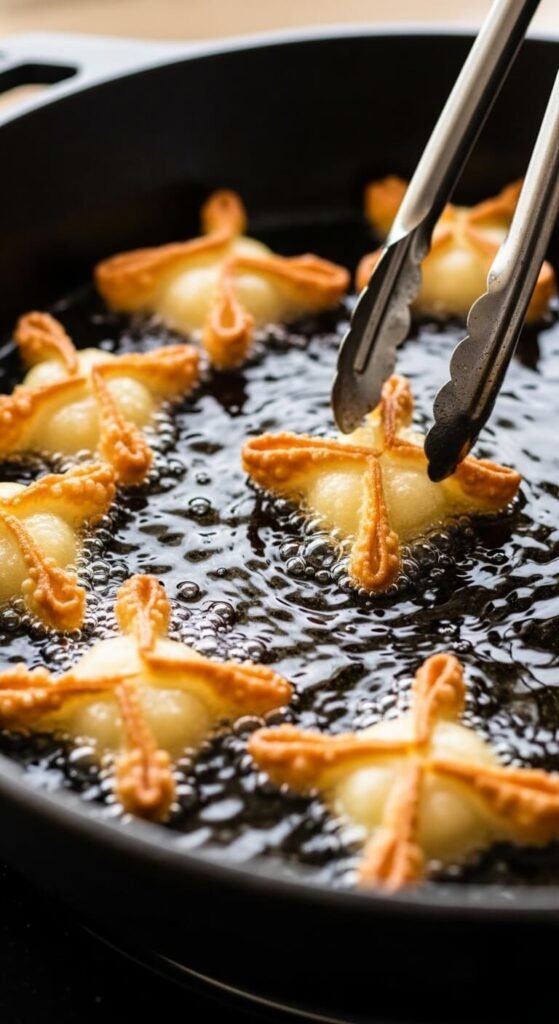 Fry in small batches — no more than 4 to 6 at a time. Crowding the oil drops the temperature fast.