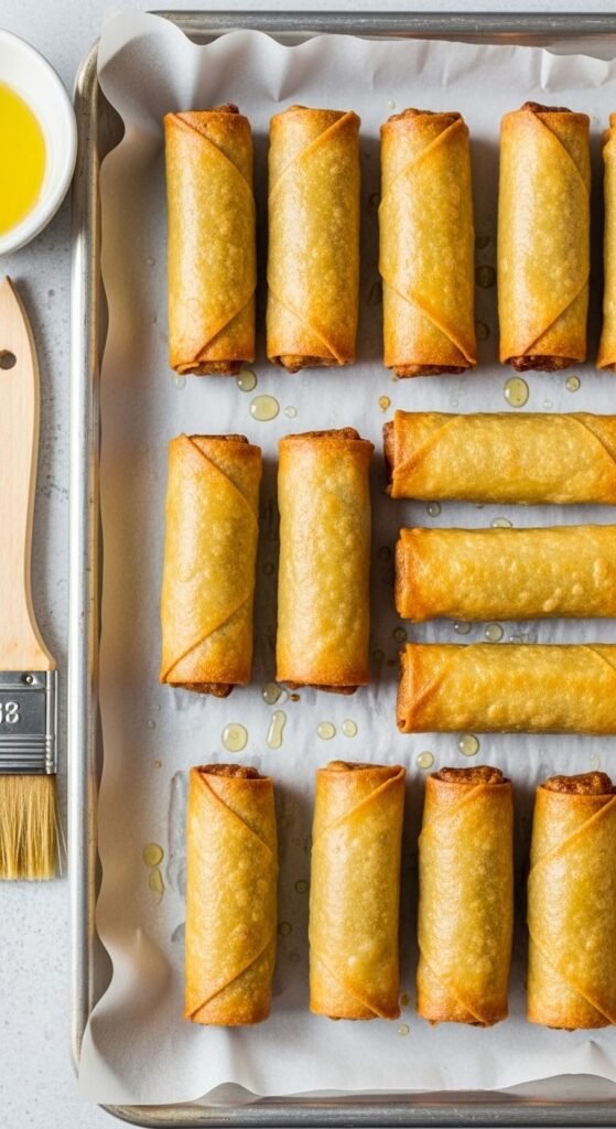 Pro tip: Place a wire rack on your baking sheet and arrange the egg rolls on top. This allows hot air to circulate completely around them for even crisping.