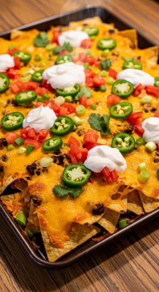 Sheet Pan Nachos — Layer tortilla chips, shredded cheese, black beans, and jalapeños on a large baking sheet. Bake at 375°F for 10–12 minutes until bubbling. Top with fresh pico, sour cream, and guacamole.