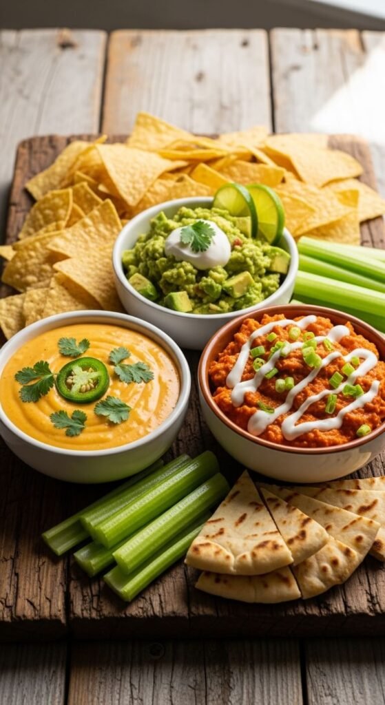 - 1–2 dips with plenty of dippers (chips, veggies, bread)