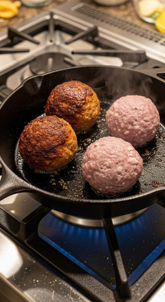 - Brown meatballs in a skillet with a bit of oil for 2-3 minutes per side