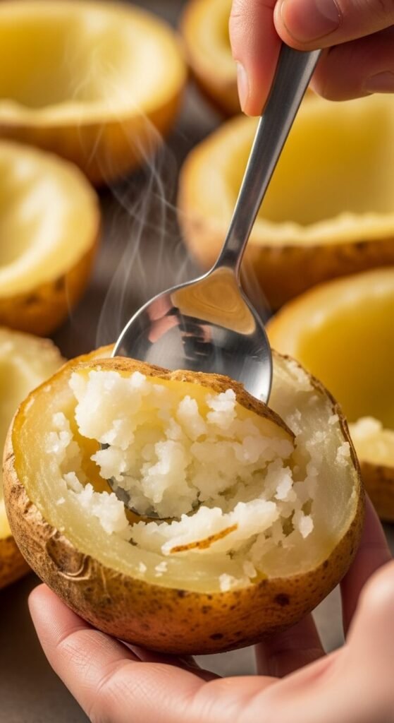 Let the potatoes cool for about 10 minutes—just until you can handle them without burning your fingers. Slice each potato in half lengthwise, then use a spoon to scoop out most of the flesh, leaving about ¼ inch of potato attached to the skin. (Pro tip: Save that scooped-out potato for mashed potatoes or potato soup later!)