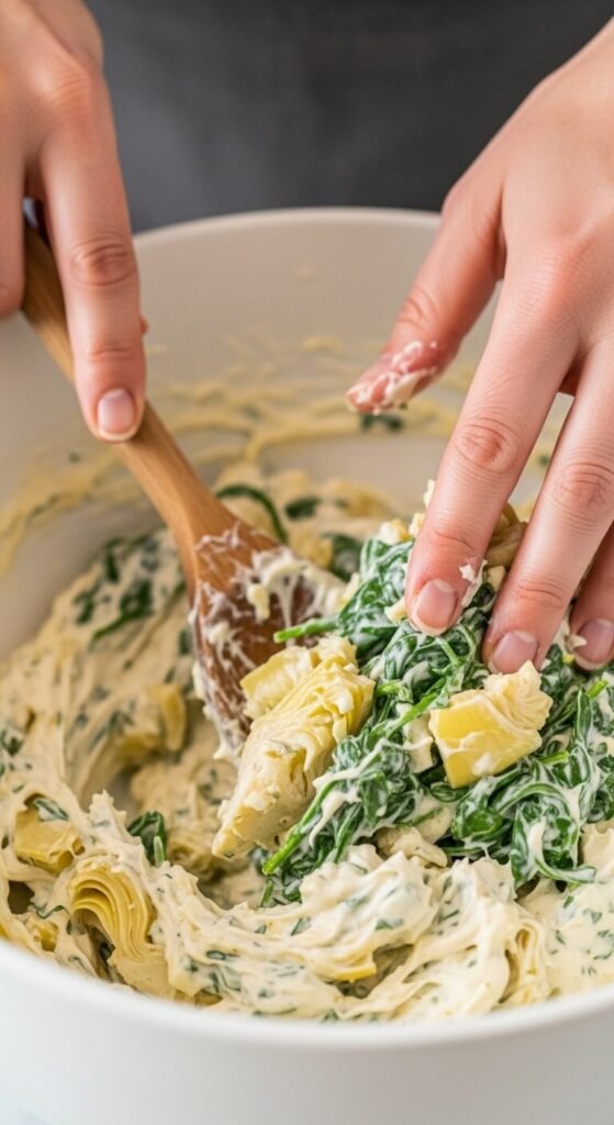 Add your squeezed-dry spinach, chopped artichokes, and half of each cheese (save the rest for topping). Fold everything together until well combined.