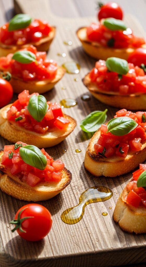 [Image Prompt] A beautiful party appetizer spread on a long wooden board with assembled bruschetta bites, small bowls of diced tomatoes and fresh herbs nearby, candles softly lit in the background, warm evening atmosphere.