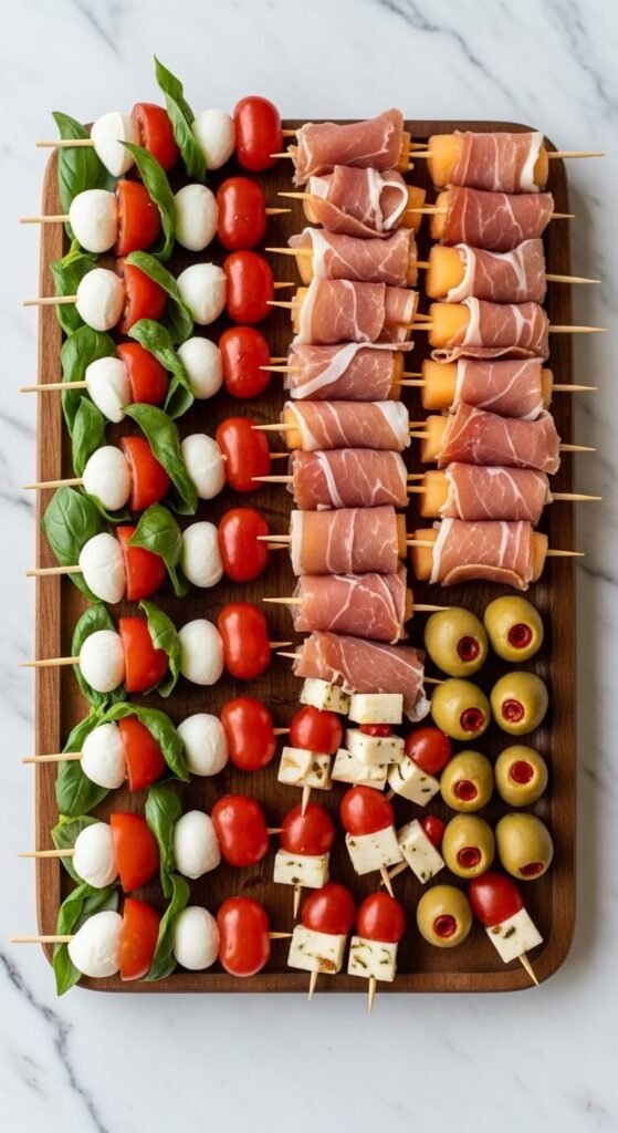 - Curl thin slices of prosciutto or salami around a melon cube or cheese ball before skewering.