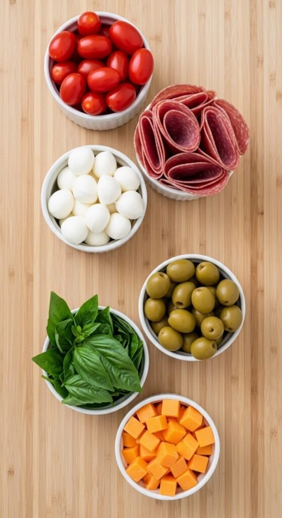 - Accents: fresh basil, olives, cornichons, sun-dried tomatoes