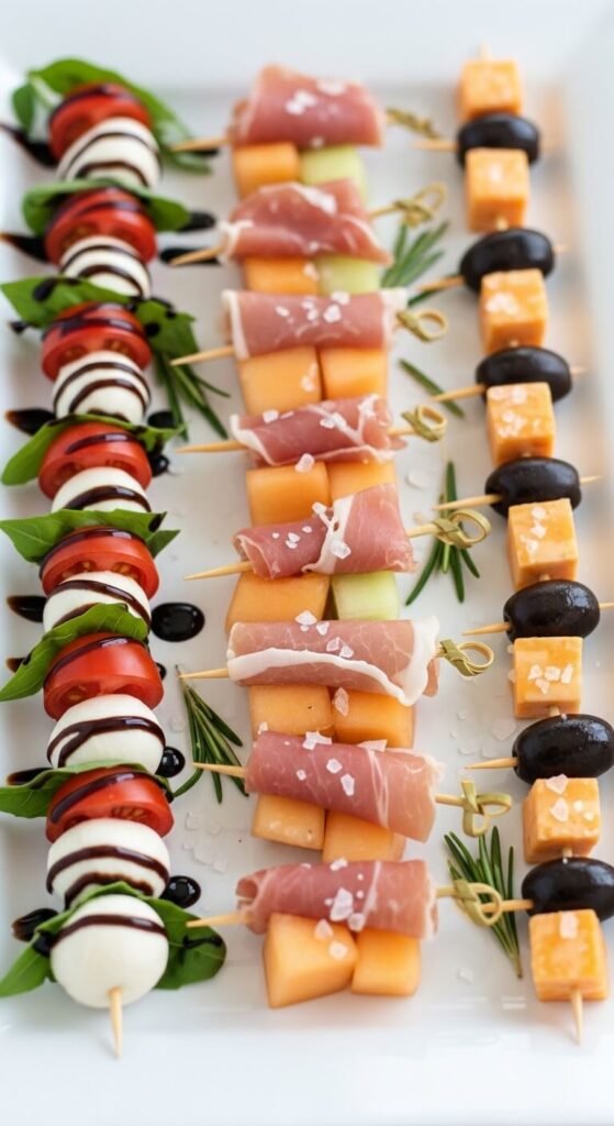 Professional appetizers look professional because they play with color. Think in terms of contrast — you want something bright, something dark, something creamy, and something fresh all on one tiny skewer.