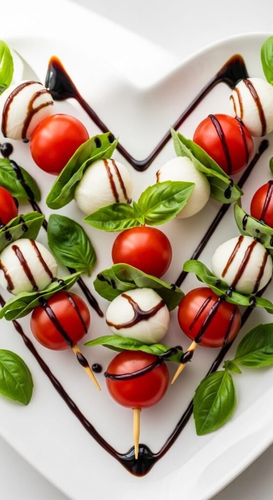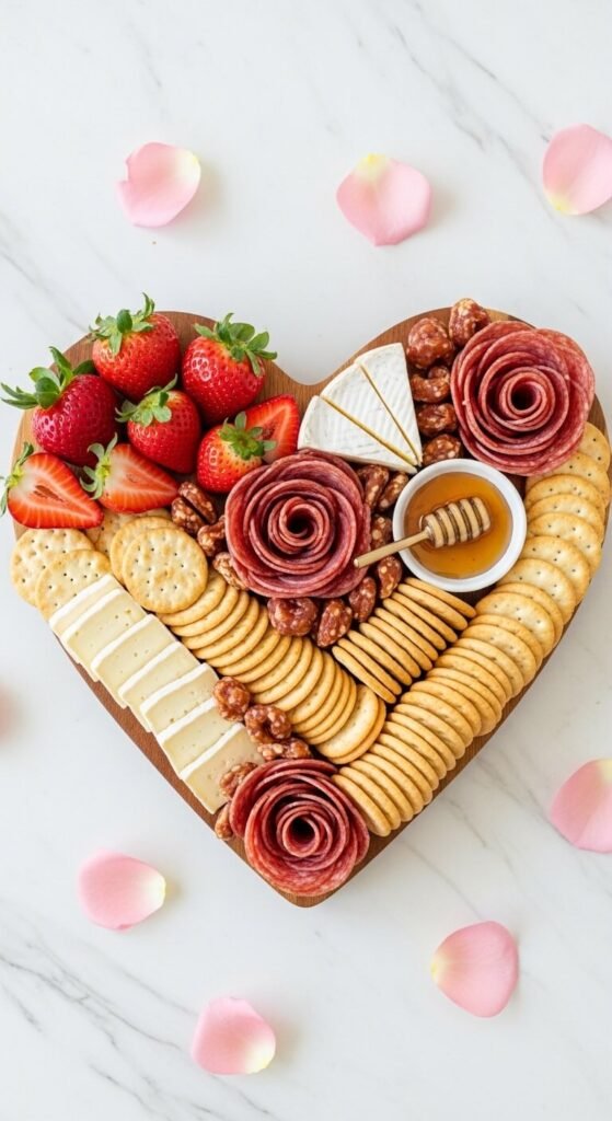 A beautiful appetizer spread doubles as a centerpiece, so presentation matters just as much as taste. Think heart shapes, deep reds and pinks, and rich textures that feel indulgent without being fussy.